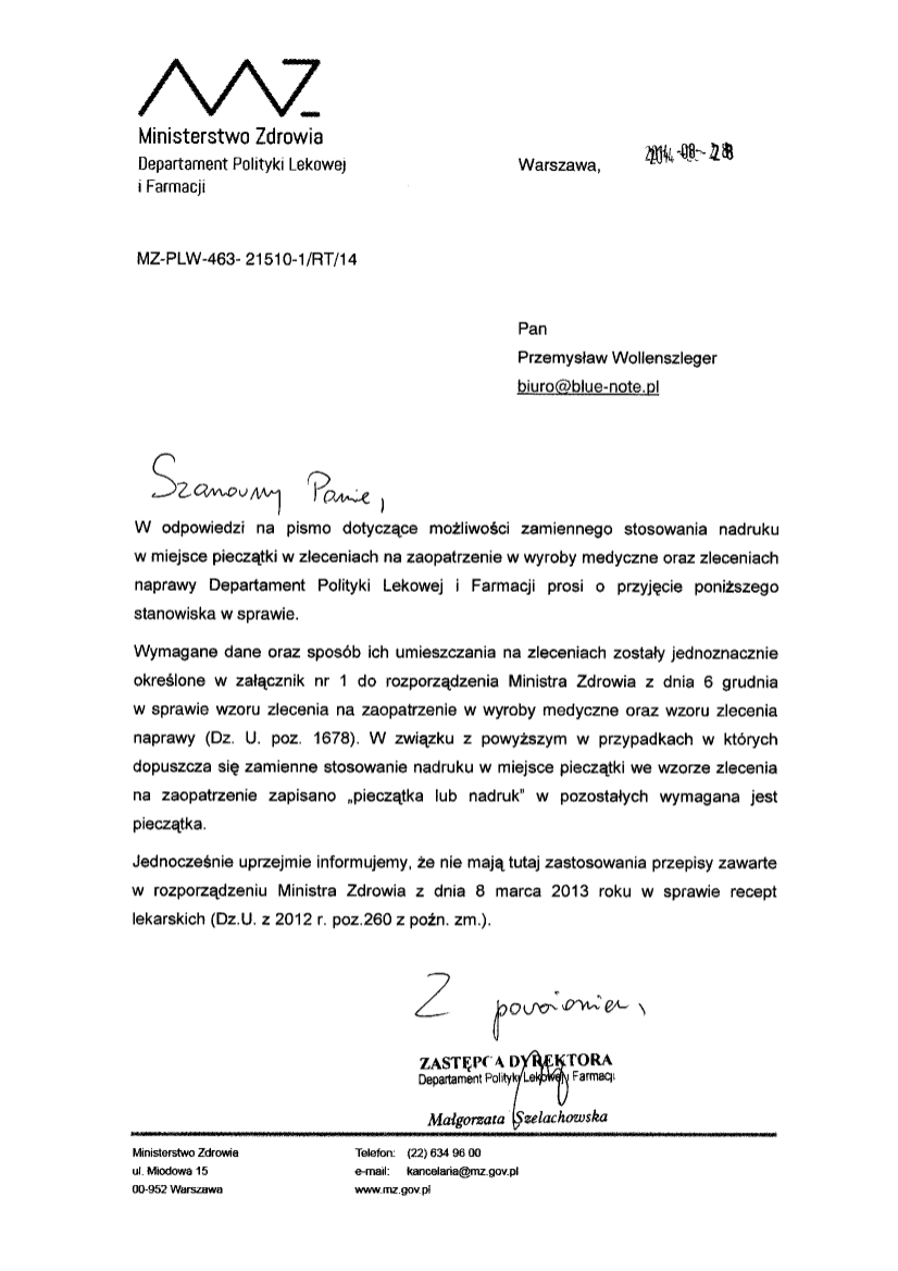 Pieczątki w zleceniach. Pozostawiam bez komentarza stanowisko Ministerstwa Zdrowia.